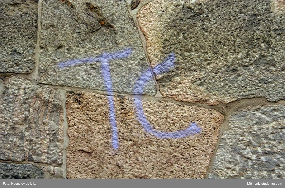 Någon har klottrat "TC." på Mölndals museums stenfasad, Norra Forsåkersgatan 19, våren 1998.