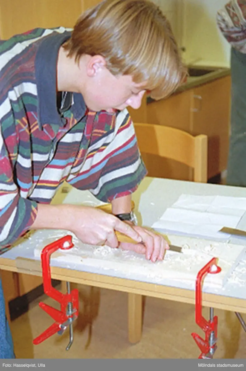 Pedagogisk verksamhet i samband med tillfällig utställning "Lindomemöbler". Bildhuggeri och ådermålning (Almåsskolan klass 8). Se även 1994_0998-1994_1034 samt 1994_1046-1994_1061.
