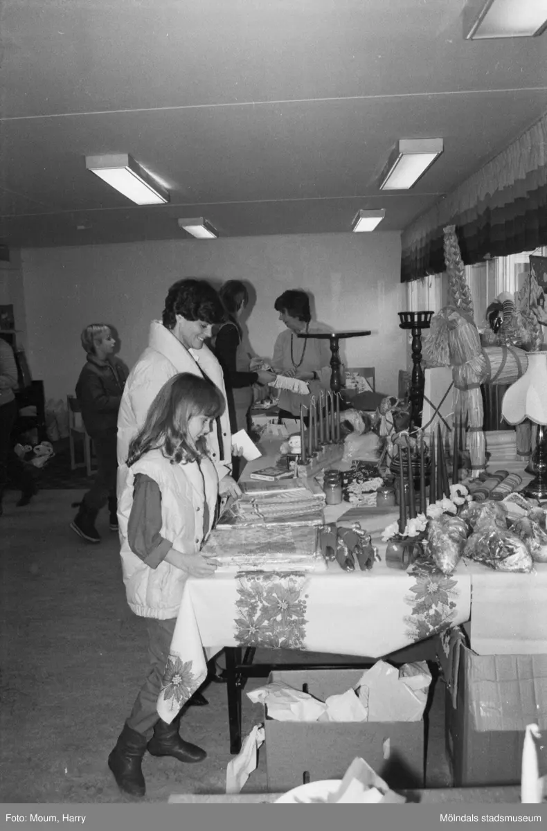 Lotteri och försäljning i Sankt Johanneskyrkan vid Sagbrovägen i Lindome, år 1983. "Mona och Pia Mattsson kollar in vinsterna."