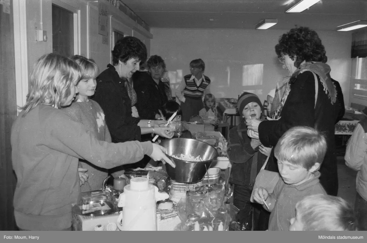 Lotteri och försäljning i Sankt Johanneskyrkan vid Sagbrovägen i Lindome, år 1983. "Linda Johansson och Mari Larsson frestar med fina lotter."