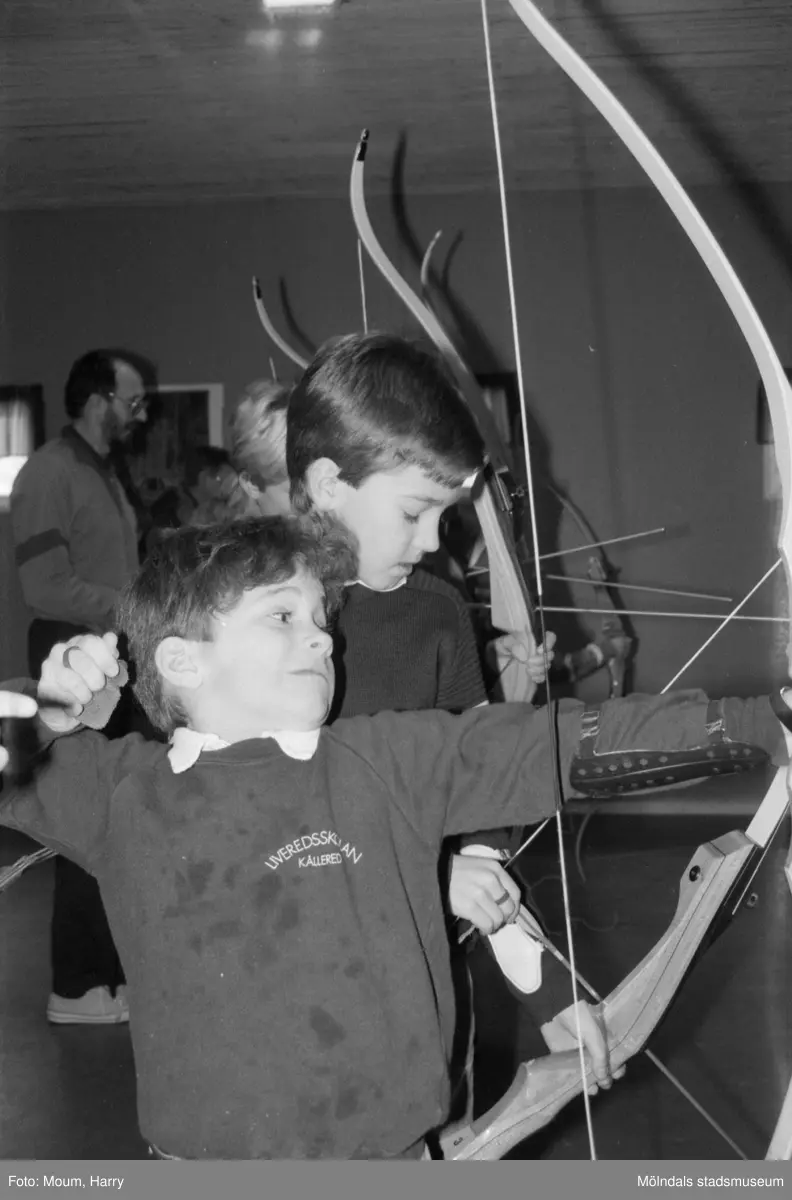 Titel: Bågskytte för barn under februarilovet i Mölndal, år 1985. För mer information om bilden se under tilläggsinformation.