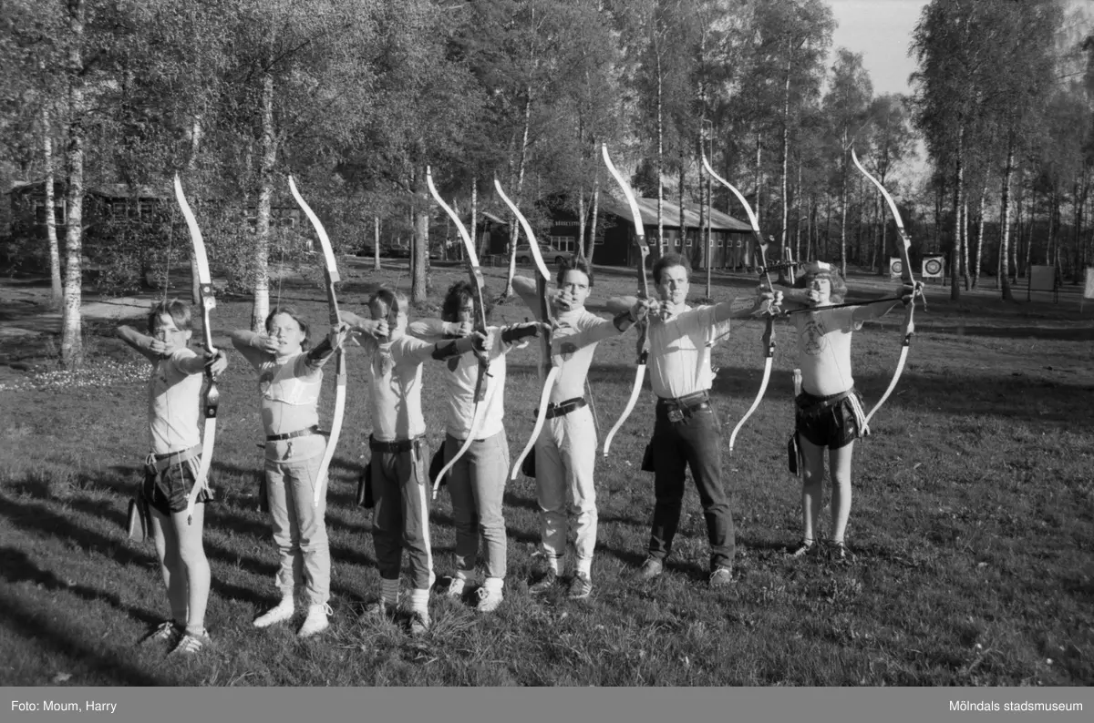 Bågskyttar i Lindome bågskytteklubb, år 1985. "Mikael Lundin, Petra Ericsson, Jonas Henriksson, Susann Lindström, Henrik (?) , Peter Henriksson, Morgan Lundin."