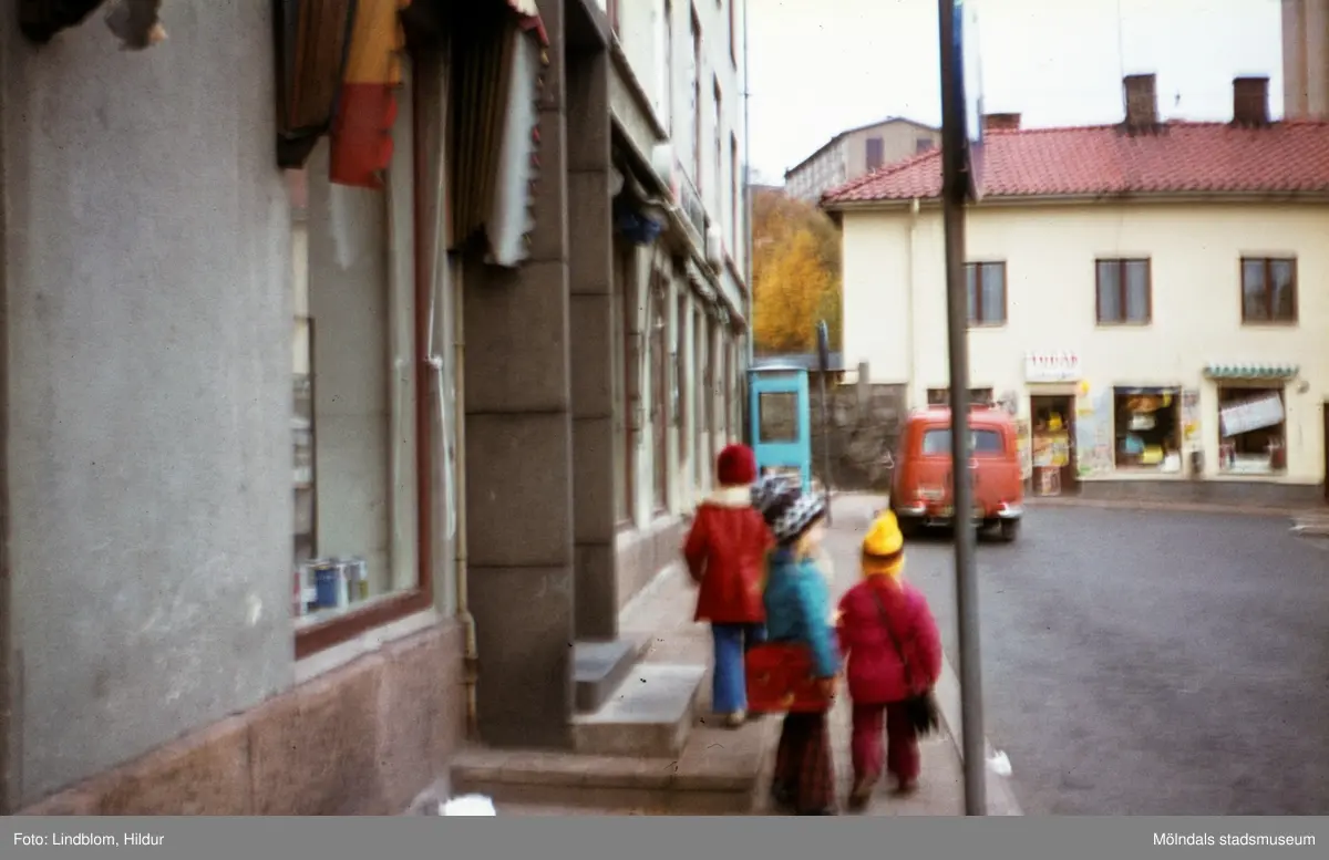 Tre små flickor utanför huset Kvarnbygatan 43 vid Gamla Torget i Mölndal, 1970-tal. Huset var tidigare Mölndals stadshus, sedermera musikskola. I bakgrunden ses även huset Kvarnbygatan 45.