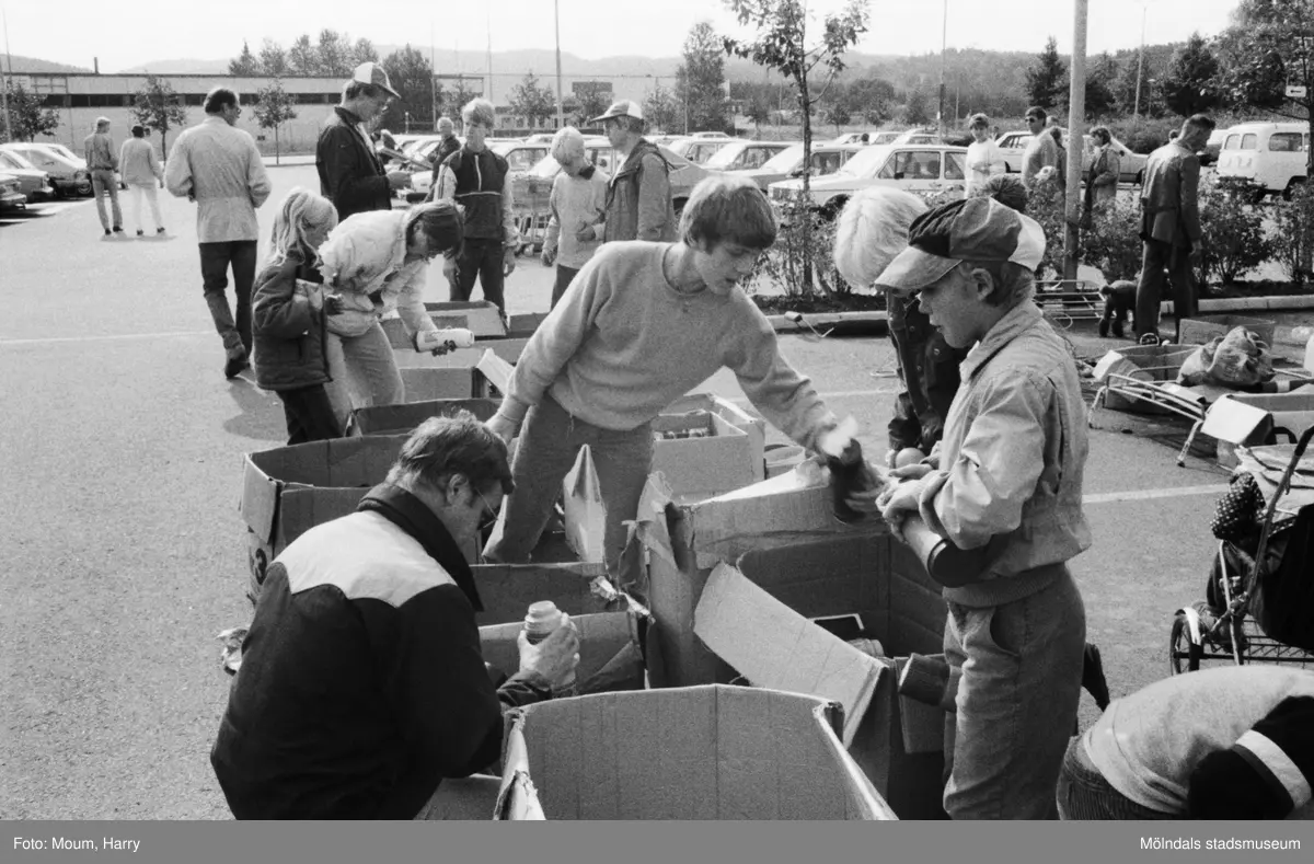 Lindome Frikyrkoförsamlings ungdomssektion håller sin årliga loppmarknad i Lindome centrum, år 1983.
