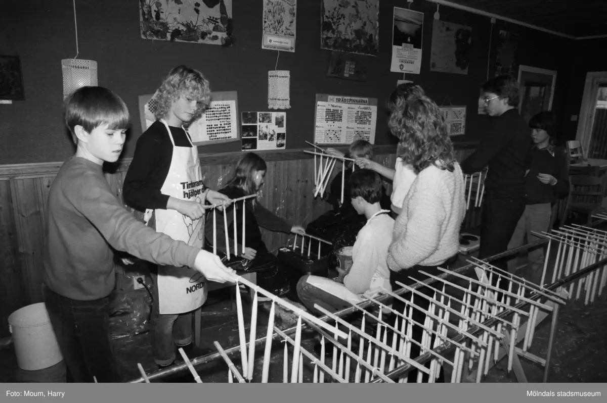 Ungdomar från Annestorpdalens scoutkår stöper ljus i scoutgården på Konditorivägen 3 i Lindome, år 1983. "Annestorpsdalens flitiga scouter kan konsten att stöpa ljus."
