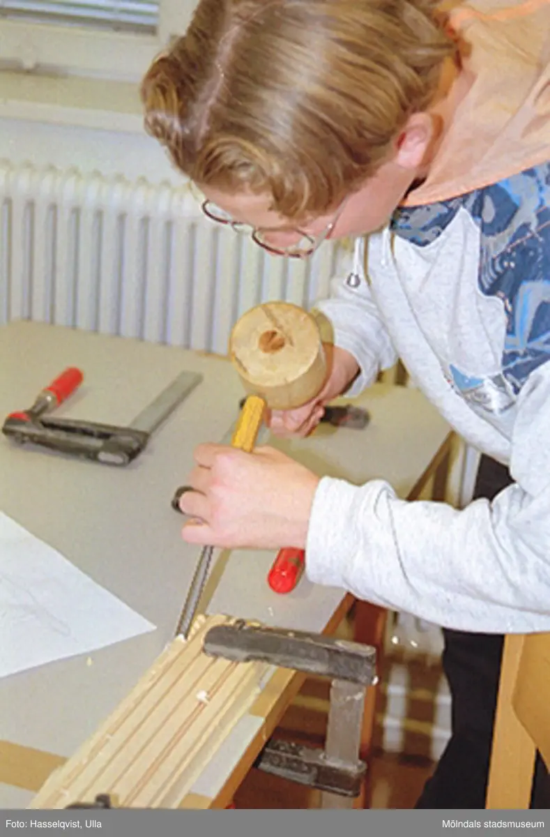 Pedagogisk verksamhet i samband med tillfällig utställning "Lindomemöbler". Bildhuggeri och ådermålning (Almåsskolan klass 8). Se även 1994_0998-1994_1034 samt 1994_1046-1994_1061.