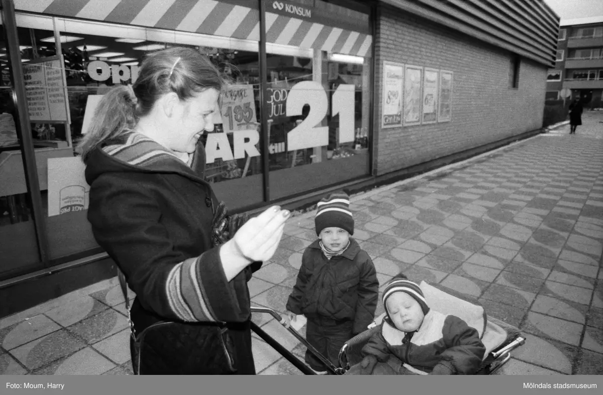 Åsa Wahlberg med sönerna Christer och Johan i Kållereds centrum, år 1983.