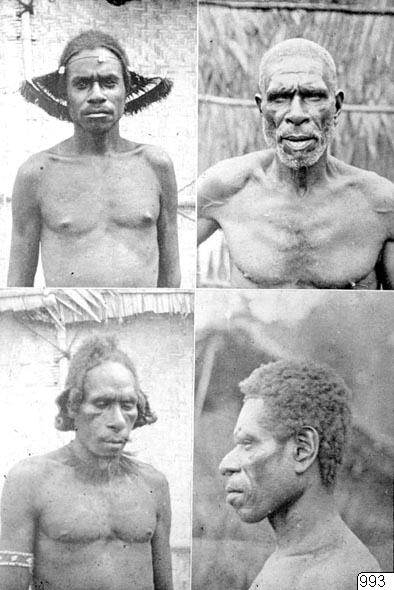 Motiv: Papuanska typer. Lokal: Nya Guinea. Foto för skioptikon, datum okänd, erhållen gm. köp av Dr. Kaunderns bildmaterial, 1947. Publ. C.G. Rawling: The Land of the New Guinea Pygmies. London 1913, pl. vid p. 50. (katalogkort)
