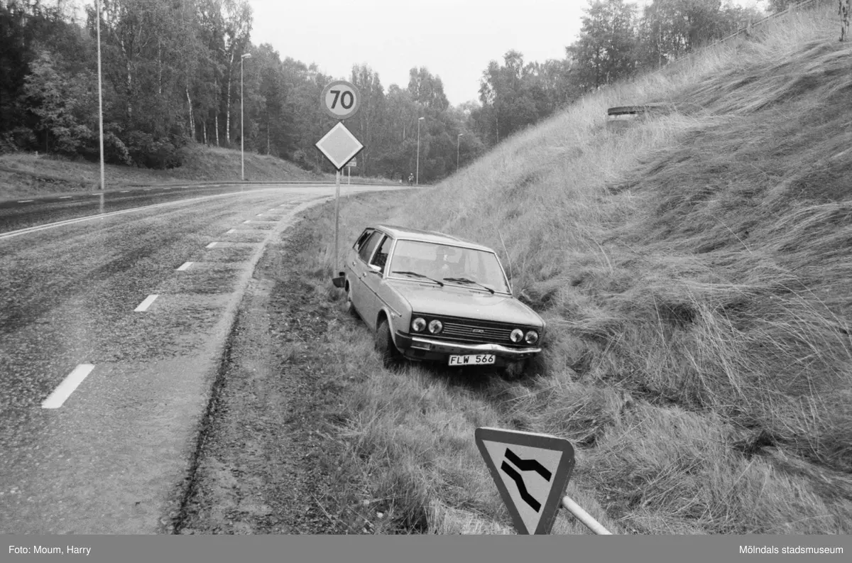Bil som kört i diket vid Östra Lindomevägen i Kållered, år 1983. "Här var det avsmalnande väg. Så det gäller att se sig för."
