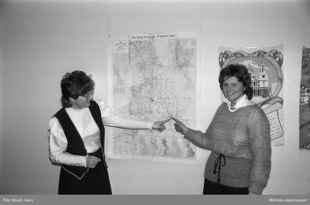 Körledare Eva Karlsson och ungdomsledare Lena Forsberg framför en karta, år 1984. "Hit går flickkörens drömresa. Eva Karlsson körledare och Lena Forsberg (t h) ungdomsledare håller pekfingern på miljonstaden London."