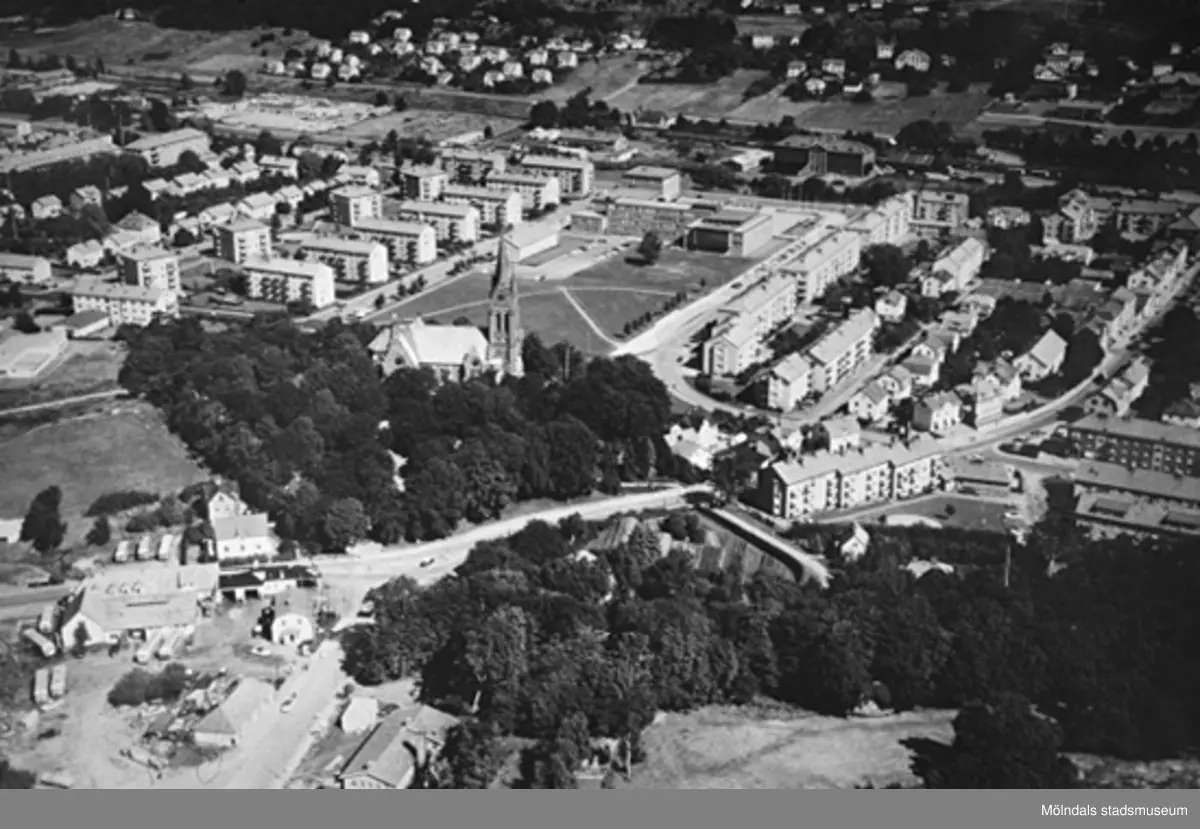 Flygfoto västerifrån över Fässbergs kyrka, Bosgården och Mölndalsbro-området, okänt årtal.