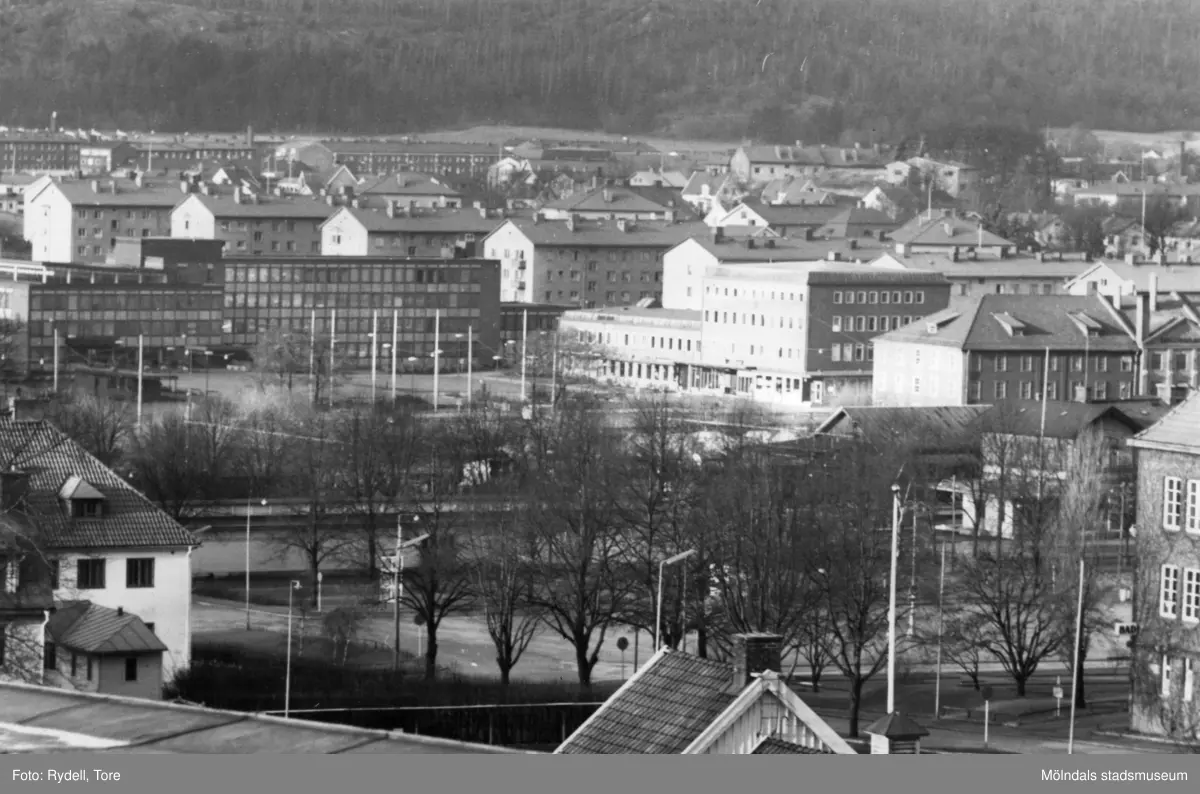 Vy från pappersbruket Papyrus fabriksområde i Forsåker, Mölndal, mot Stadshuset och Folkets Hus i Mölndals centrum på 1960-talet. I bakgrunden ses bostadsbebyggelse i Bosgården.