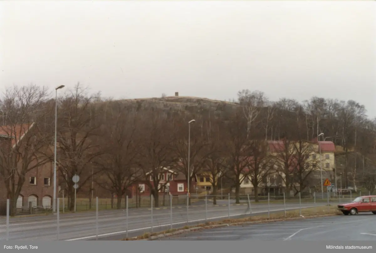 Vy över Kvarnbygatan mot bebyggelse vid Trädgårdsgatan i Trädgården, Mölndal, på 1970-talet. I mitten, rödmålat hus, ses Trädgårdsgatan 10, även kallat "Klubben" då det var klubbhus för Kvarnby basket. Till höger ses Norénska stiftelsens ålderdomshem.