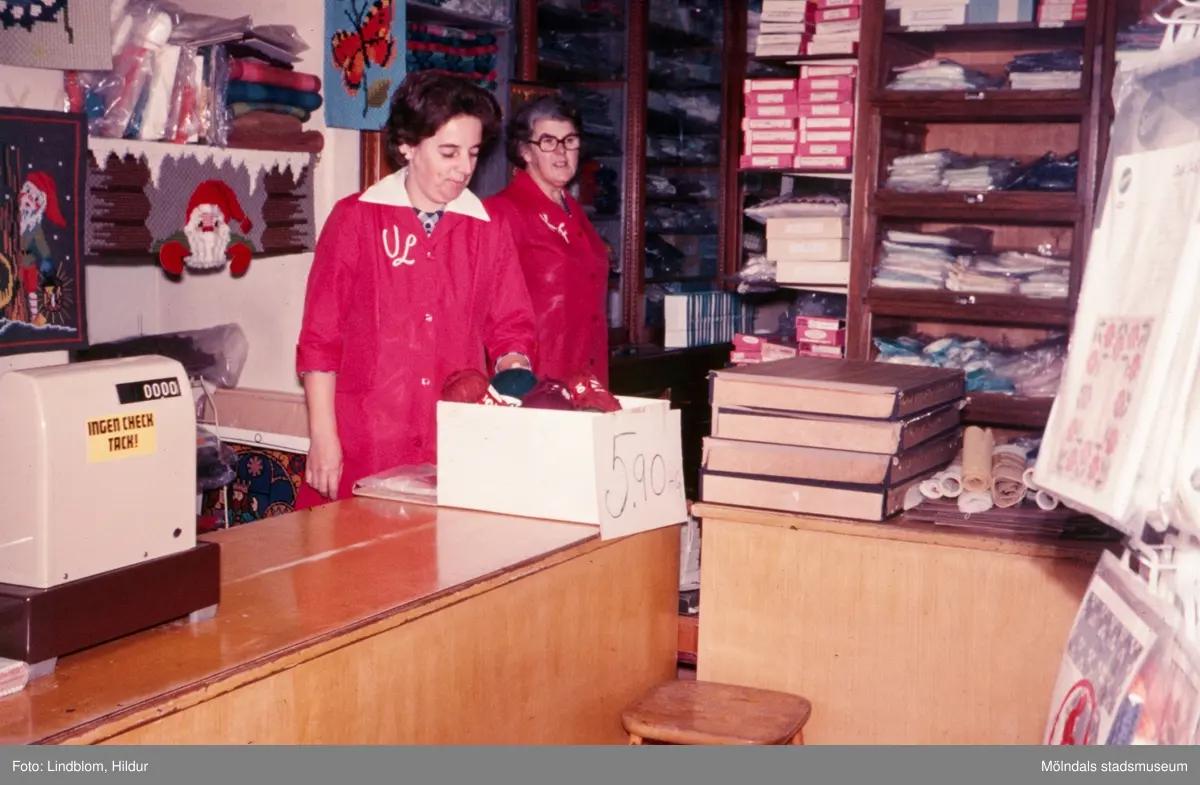 Från vänster Ulla Lindqvist och till höger Kajsa Forsell (född Andersson) som står vid kassan i "Kvarnbyns Trikåaffär" på Kvarnbygatan 37, 1970-tal. Affären var inriktad på bl.a. garner och handarbeten. Kajsa köpte affären ca 1950 från Inessa Skoglund och drev den tills huset revs på 70-talet. Ulla Lindqvist kom senare att arbeta i Rasmussons skoaffär.