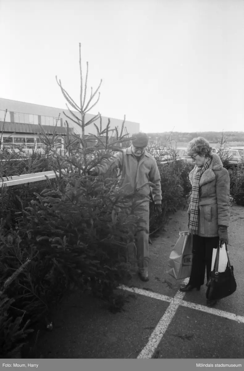 Försäljning av julgranar utanför i IKEA i Kållered, år 1983. "Birgitta Lundin och Gunnar Engelbrektsson tittar på julgranar."