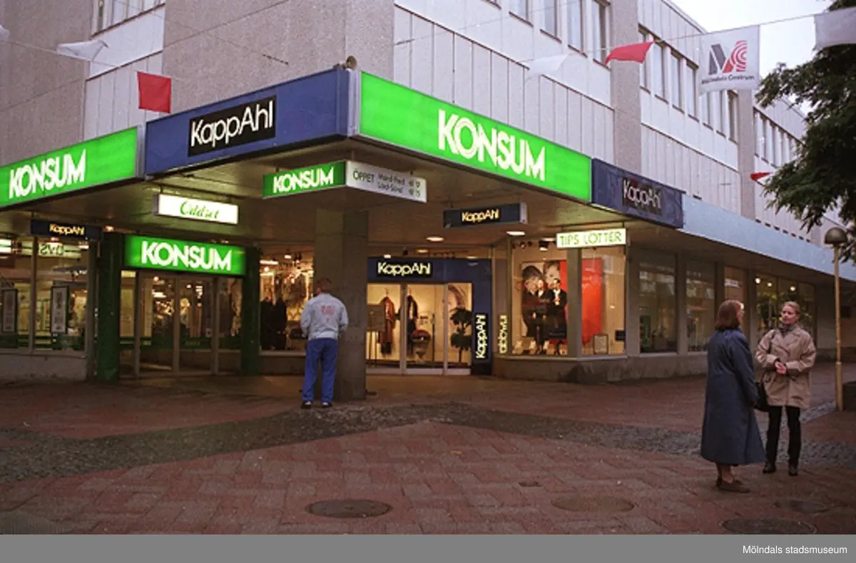 Konsum på Brogatan. Mölndalsbro i dag - ett skolpedagogiskt dokumentationsprojekt på Mölndals museum under oktober 1996. 1996_1173-1187 är gjorda av högstadieelever från Kvarnbyskolan 9D, grupp 3. Se även 1996_0913-0940.