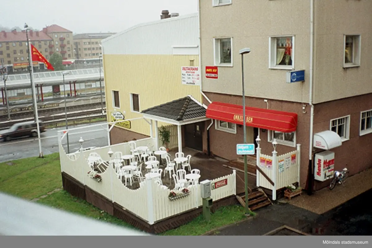 Butik och restaurang på Nämndemansgatan 1, östra sidan av järnvägen. Mölndalsbro i dag - ett skolpedagogiskt dokumentationsprojekt på Mölndals museum under oktober 1996. 1996_1212-1226 är gjorda av högstadieelever från Kvarnbyskolan 9D, grupp 5. Se även 1996_0913-0940.