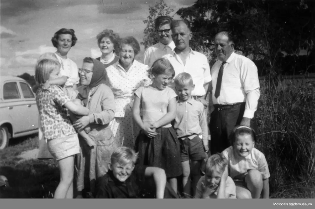 Inga-Lill Lipovsék, boende på Stretereds skolhem, omgiven av en grupp människor i olika åldrar vid skolhemmet.