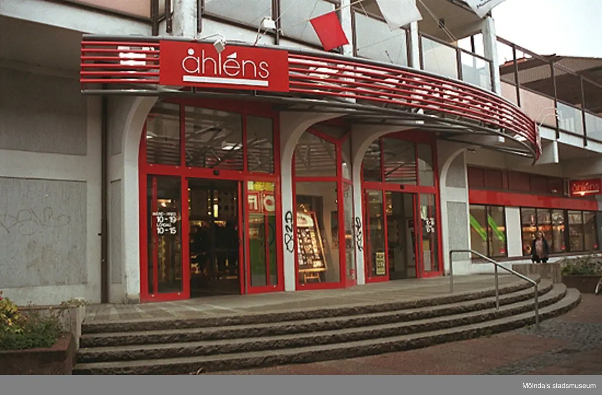 Åhléns i Hajen på Brogatan. Mölndalsbro i dag - ett skolpedagogiskt dokumentationsprojekt på Mölndals museum under oktober 1996. 1996_1190-1211 är gjorda av högstadieelever från Kvarnbyskolan 9D, grupp 4. Se även 1996_0913-0940.