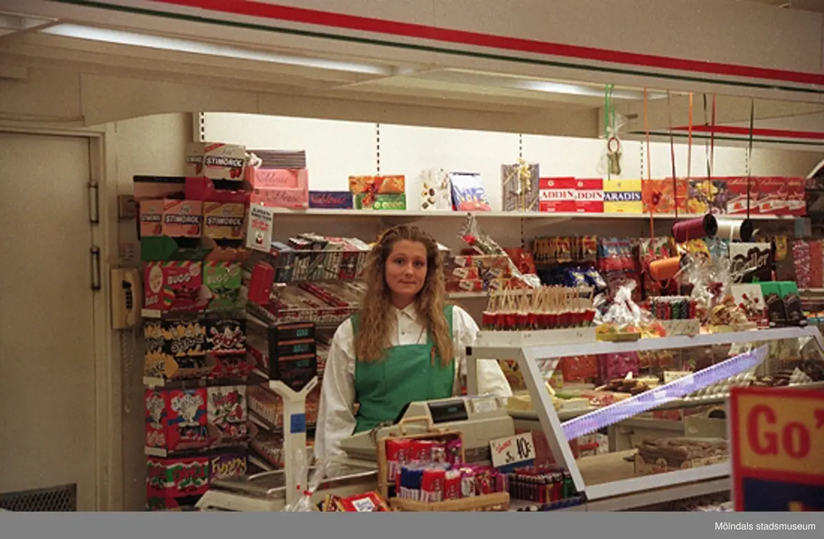 En kvinnlig expedit i Konfekthuset. Mölndalsbro i dag - ett skolpedagogiskt dokumentationsprojekt på Mölndals museum under oktober 1996. 1996_1264-1282 är gjorda av högstadieelever från Åbyskolan 8A, grupp 2. Se även 1996_0913-0940, gruppbilder på klasserna 1996_1382-1405 och bilder från den färdiga utställningen 1996_1358-1381.