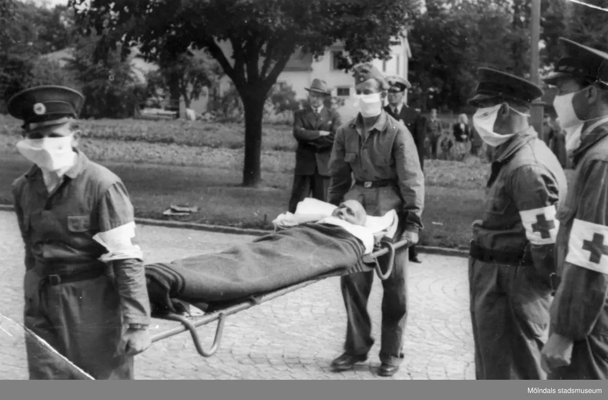 En flykting bärs in på bår av Röda Korsets personal.