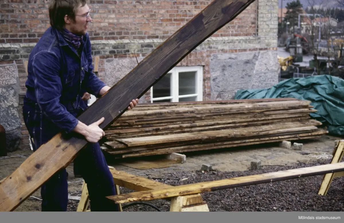 En man lyfter en bräda. Exteriörfoto från upprustningen av Mölndals Museum på Norra Forsåkersgatan 19 (Kallkällan 1) år 1985.