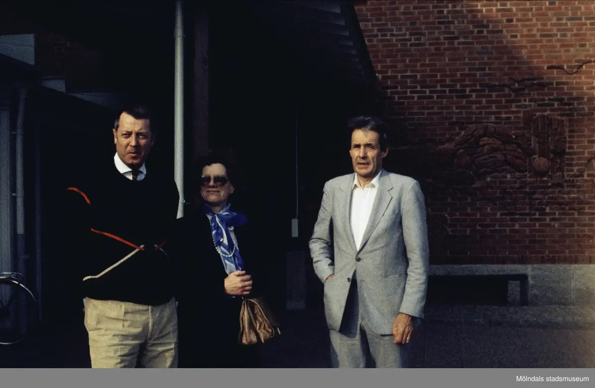 Tre personer står utanför Mölndals Museum. Mannen till höger är Hjalmar Lindqvist, chef för kulturförvaltningen. Exteriörfoto från upprustningen av Mölndals Museum på Norra Forsåkersgatan 19 (Kallkällan 1) år 1985.