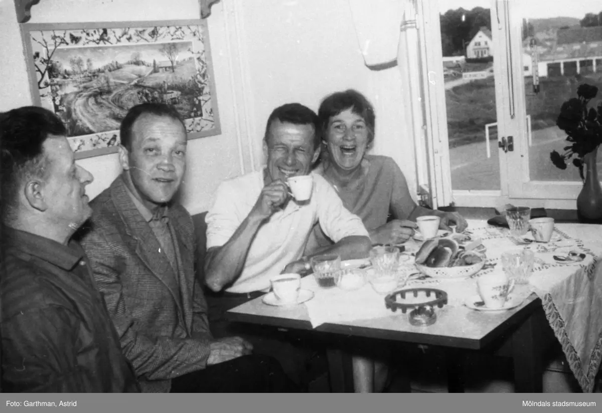 Helmer Garthman, Carl-Gustav, Bror Eriksson och Doris Eriksson sitter i köket på Lerbrännargatan 1F, 1960-tal. Obs! man ser bussgaragen genom fönstret. Skänkt av sonen Alf Garthman.