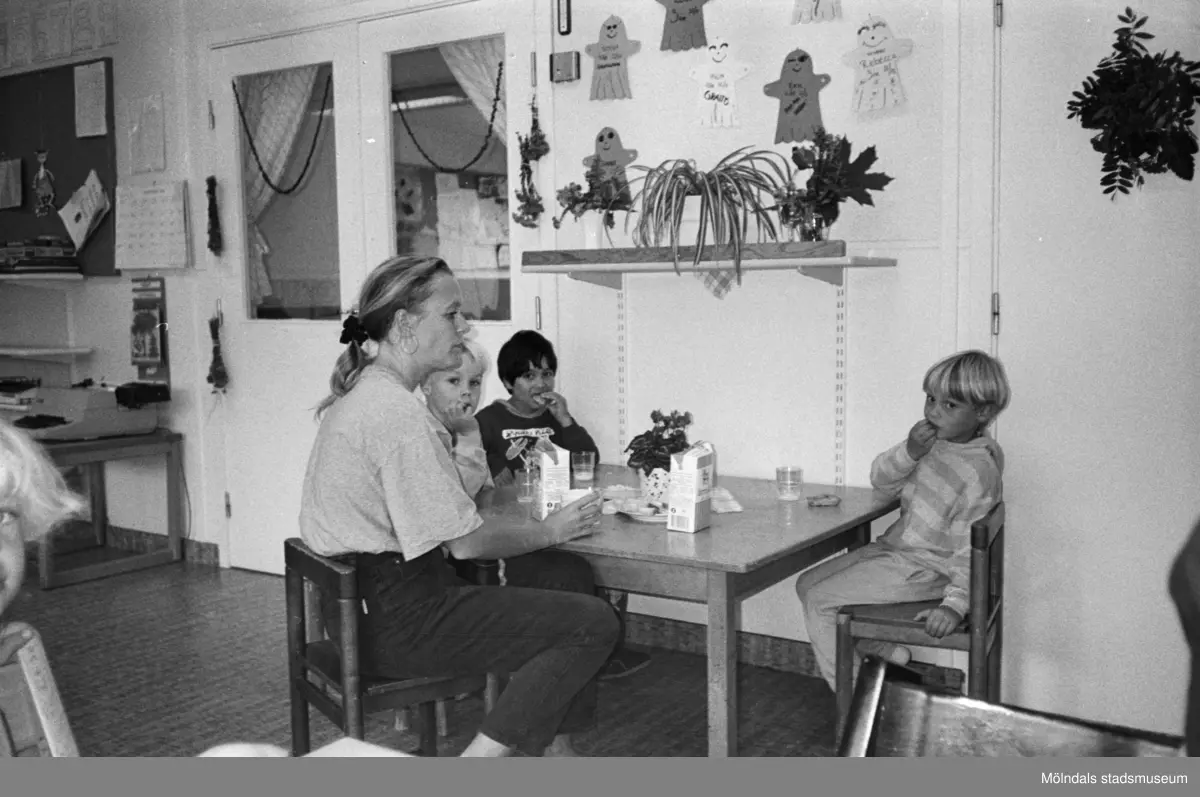 En kvinnlig förskollärare och tre pojkar sitter inomhus vid ett lågt fyrkantigt bord och fikar på Katrinebergs daghem. Ovanför dem på väggen sitter några uppklistrade teckningar samt en uppsatt hylla med växter på. Snett i bakgrunden till vänster syns ett par fönsterdörrar.