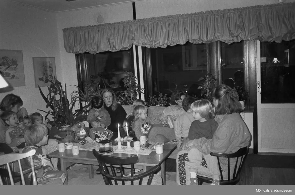 Personal och dagisbarn sitter tillsammans i en soffgrupp och fikar. En fröken, sittandes på en stol, har ett barn i famnen. I rummet finns snygga gardiner, bokhylla, köksstolar, soffa och soffbord. Det är mörkt utomhus när bilden tas, så de har tända ljus på bordet. Katrinebergs daghem.