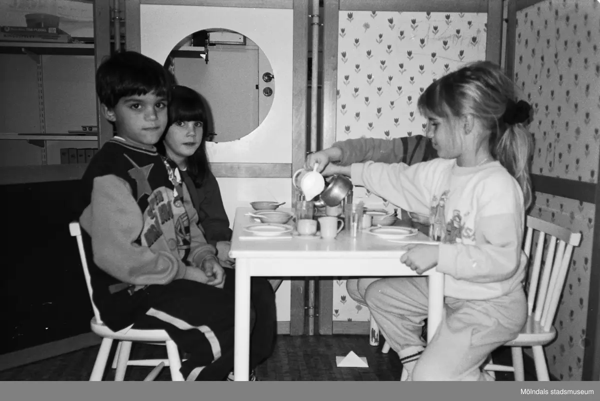 Fyra barn sitter och "fikar" vid ett barnbord. De har små kaffekoppar och fat på bordet och ett barn häller upp kaffe från en liten kittel av metall. I bakgrunden ser man en utvecklad avskärmningsdel som är klädd i olikfärgade tyger. Katrinebergs daghem, 1992.