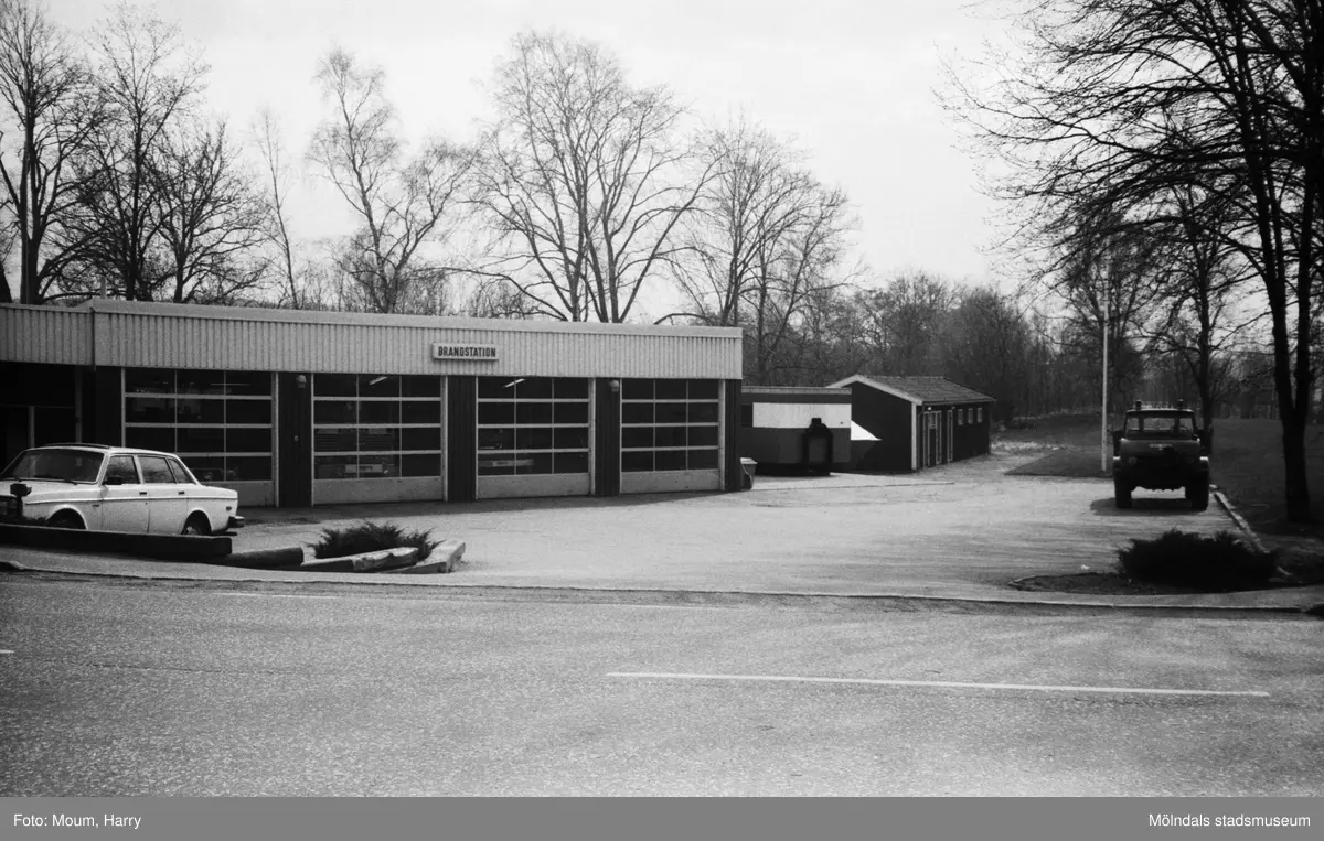 Lindome Hembygdsgille anordnar sockenvandring i Lindome, år 1983. Lindome brandstation sedd ifrån Östra Lindomevägen.