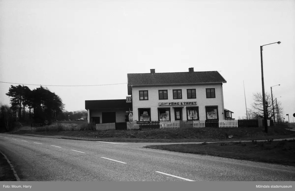 Lindome Hembygdsgille anordnar sockenvandring i Lindome, år 1983. Lasses färg & tapet vid Konditorivägen sedd ifrån Östra Lindomevägen.