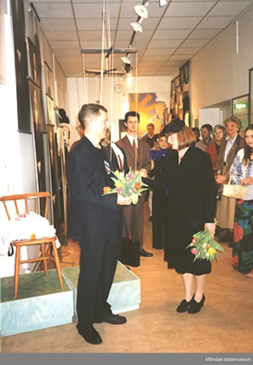 Invigning 1995-02-05 av Mölndals Museums nya utställning "Krinoliner och kortkort". Kulturchef Kenneth Strandborg och museichef Mari-Louise Olsson står mitt emot varandra.