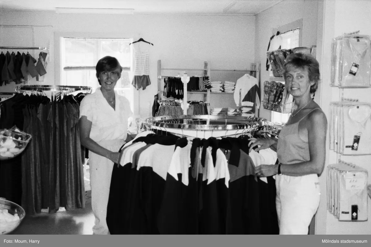 Klädaffären Öbergs Lagerförsäljning i stationshuset i Lindome, år 1983. "Några tågbiljetter säljs inte på Lindome station. Men Christina Edberg och Marita Unell har öppnat klädaffär."