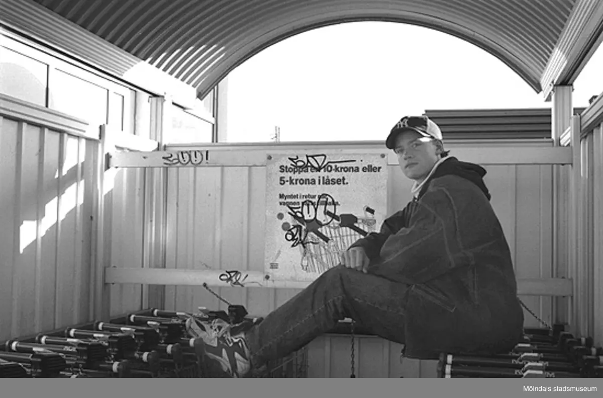 En kille som sitter på kundvagnar i ett kundvagnsgarage. Mölndalsbro i dag - ett skolpedagogiskt dokumentationsprojekt på Mölndals museum under oktober 1996. 1996_1024-1041 är gjorda av högstadieelever från Kvarnbyskolan 9C, grupp 1. Se även 1996_0913-0940, gruppbilder på klasserna 1996_1382-1405 samt bilder från den färdiga utställningen 1996_1358-1381.