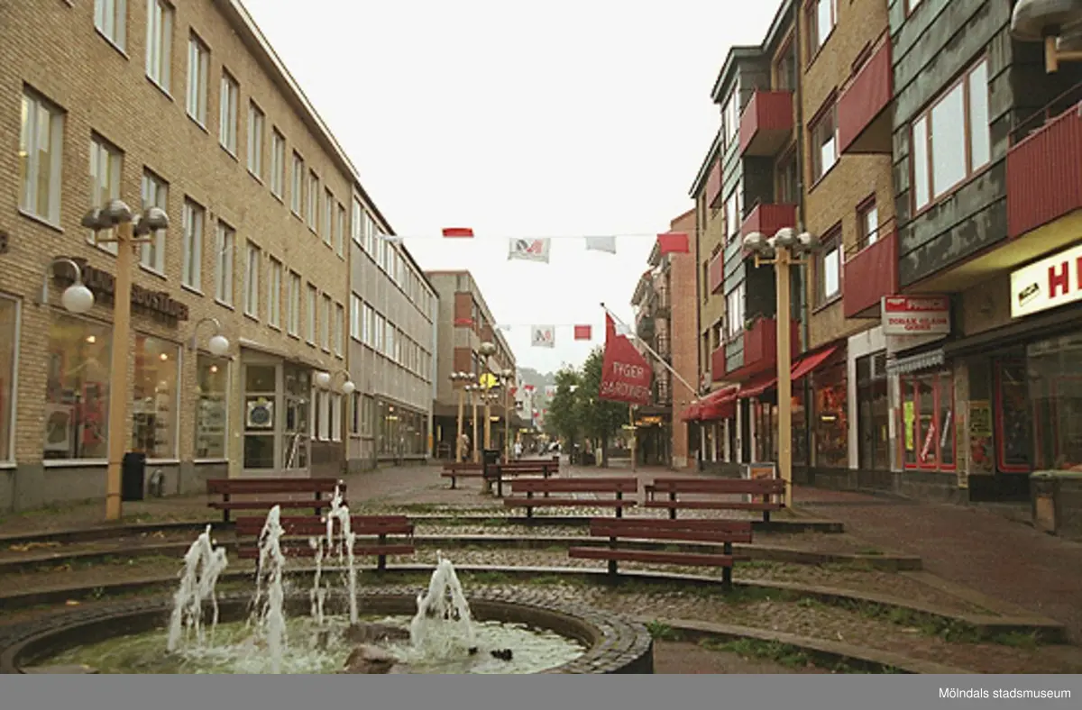 Fontän på Brogatan, västerut. Mölndalsbro i dag - ett skolpedagogiskt dokumentationsprojekt på Mölndals museum under oktober 1996. 1996_1135-1152 är gjorda av högstadieelever från Kvarnbyskolan 9D, grupp 1. Se även 1996_0913-0940, gruppbilder på klasserna 1996_1382-1405 samt bilder från den färdiga utställningen 1996_1358-1381.