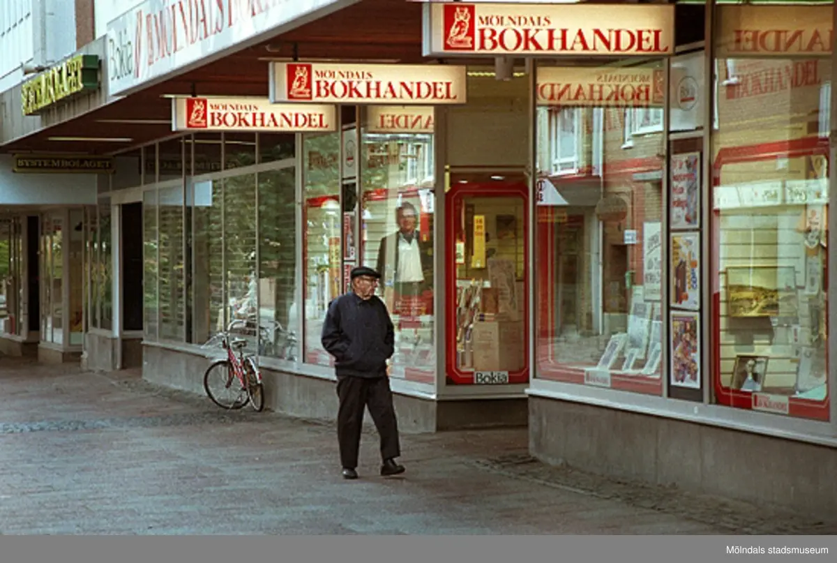 En man går förbi Mölndals bokhandel på Brogatan. Mölndalsbro i dag - ett skolpedagogiskt dokumentationsprojekt på Mölndals museum under oktober 1996. 1996_1264-1282 är gjorda av högstadieelever från Åbyskolan 8A, grupp 2. Se även 1996_0913-0940, gruppbilder på klasserna 1996_1382-1405 och bilder från den färdiga utställningen 1996_1358-1381.
