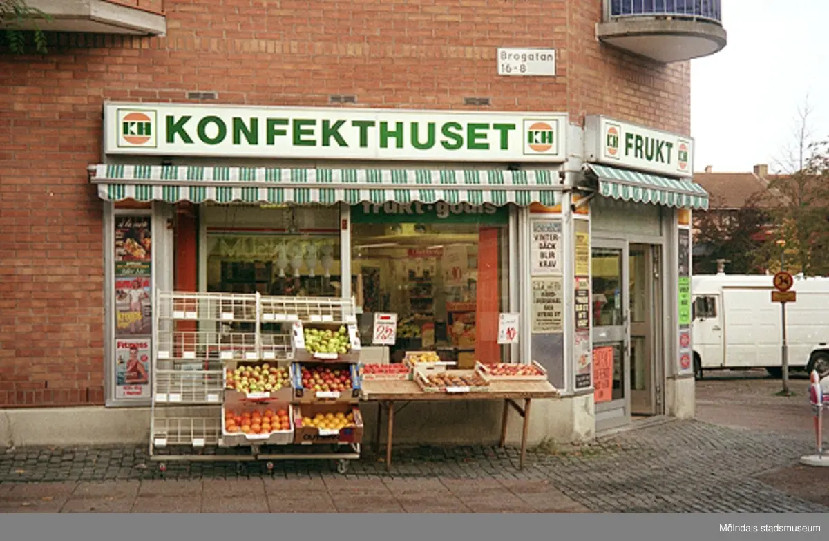 Konfekthuset på Brogatan 8. Mölndalsbro i dag - ett skolpedagogiskt dokumentationsprojekt på Mölndals museum under oktober 1996. 1996_1338-1356 är gjorda av högstadieelever från Åbyskolan 8A, grupp 6. Se även 1996_0913-0940, gruppbilder på klasserna 1996_1382-1405 och bilder från den färdiga utställningen 1996_1358-1381.