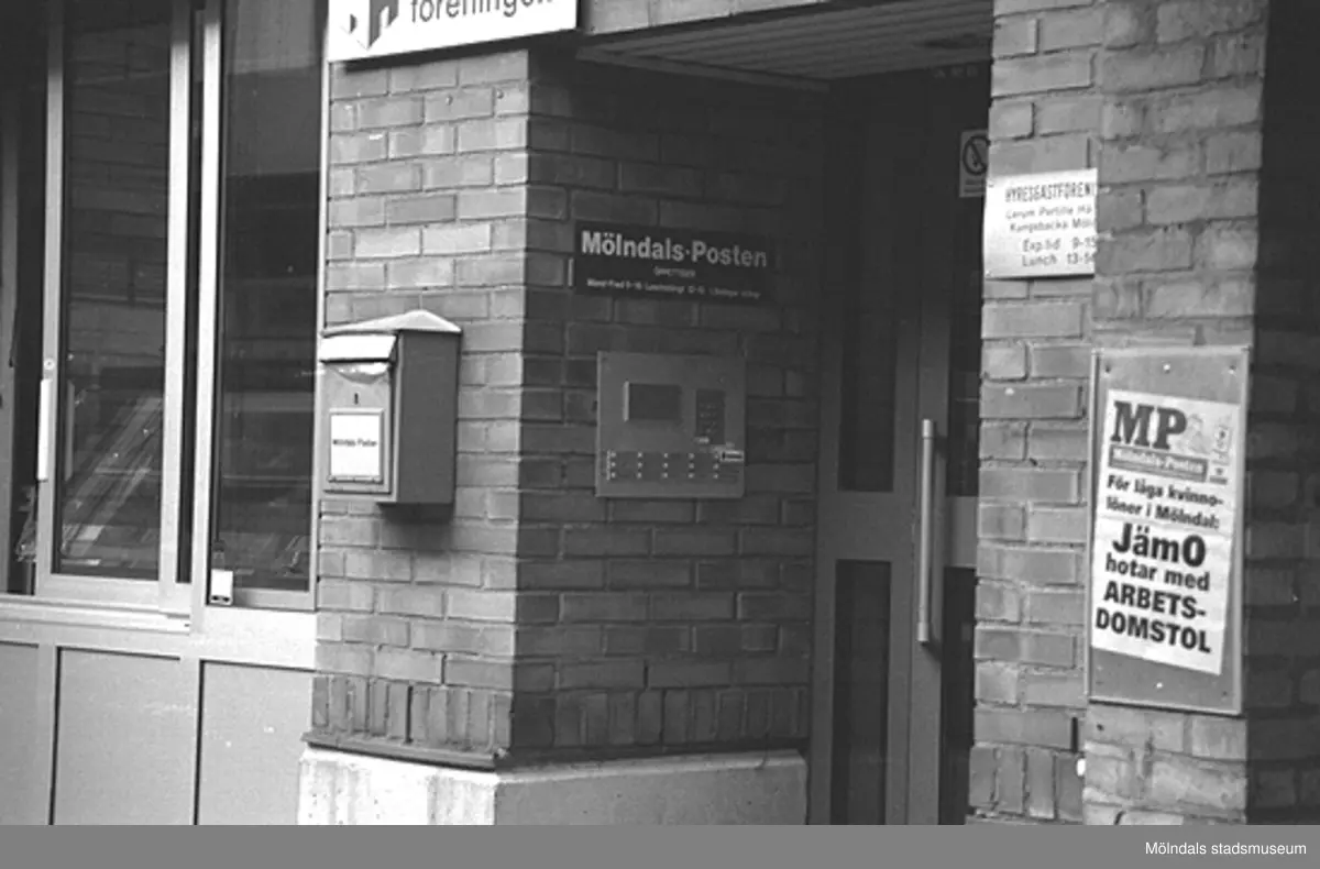 En brevlåda utanför Mölndals-Postens redaktion. Mölndalsbro i dag - ett skolpedagogiskt dokumentationsprojekt på Mölndals museum under oktober 1996. 1996_0991-1004 är gjorda av högstadieelever från Kvarnbyskolan 9A, grupp 5. Se även 1996_0913-0940, gruppbilder på klasserna 1996_1382-1405 samt bilder från den färdiga utställningen 1996_1358-1381.