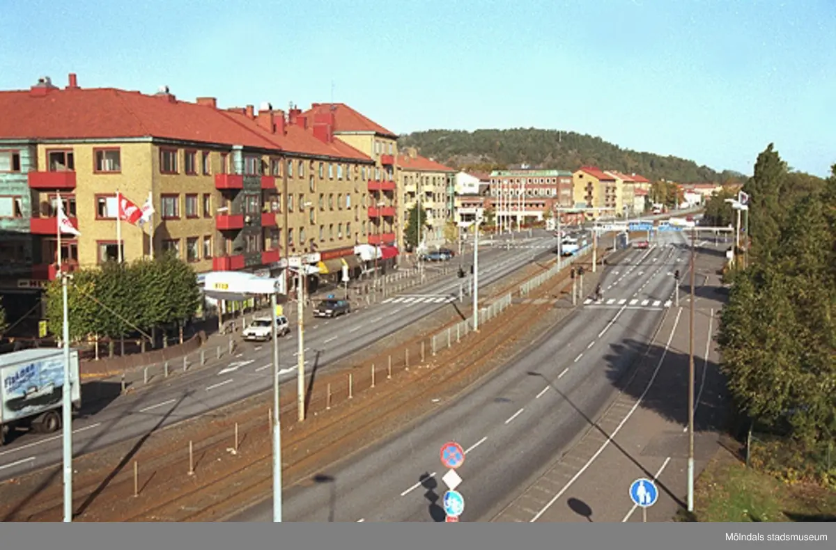 Vy från bron på spårvägsnätet norrut. Mölndalsbro i dag - ett skolpedagogiskt dokumentationsprojekt på Mölndals museum under oktober 1996. 1996_1116-1134 är gjorda av högstadieelever från Kvarnbyskolan 9C, grupp 6. Se även 1996_0913-0940, gruppbilder på klasserna 1996_1382-1405 samt bilder från den färdiga utställningen 1996_1358-1381.