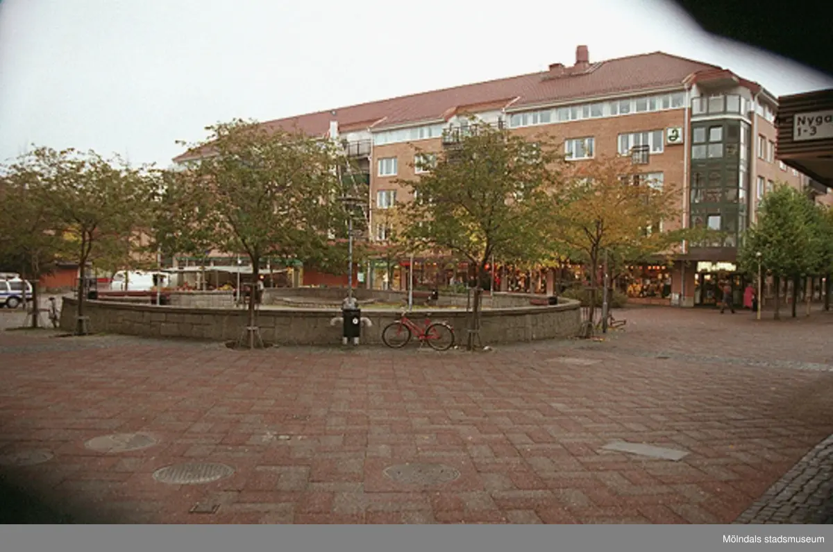 Mölndals torg med Havskatten 17 (Mölndals torg 1-6) i bakgrunden. Mölndalsbro i dag - ett skolpedagogiskt dokumentationsprojekt på Mölndals museum under oktober 1996. 1996_1153-1171 är gjorda av högstadieelever från Kvarnbyskolan 9D, grupp 2. Se även 1996_0913-0940.