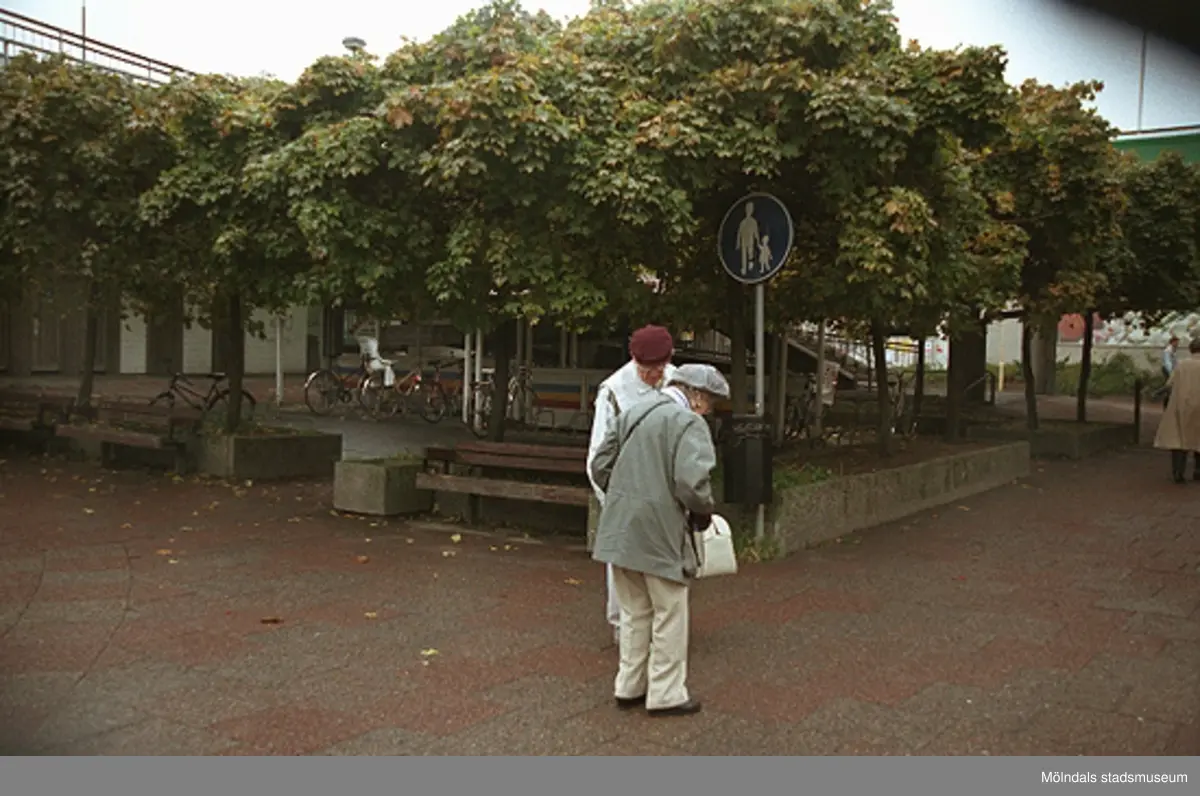 Två äldre personer står vid Broplatsen. Bron skymtas till vänster. Mölndalsbro i dag - ett skolpedagogiskt dokumentationsprojekt på Mölndals museum under oktober 1996. 1996_1153-1171 är gjorda av högstadieelever från Kvarnbyskolan 9D, grupp 2. Se även 1996_0913-0940.
