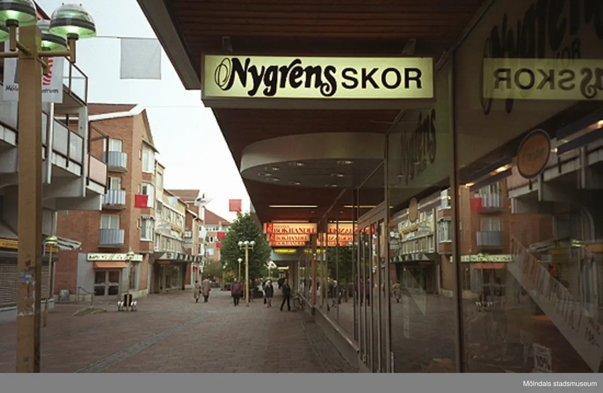 Nygrens skor på Brogatan. Mölndalsbro i dag - ett skolpedagogiskt dokumentationsprojekt på Mölndals museum under oktober 1996. 1996_1338-1356 är gjorda av högstadieelever från Åbyskolan 8A, grupp 6. Se även 1996_0913-0940, gruppbilder på klasserna 1996_1382-1405 och bilder från den färdiga utställningen 1996_1358-1381.