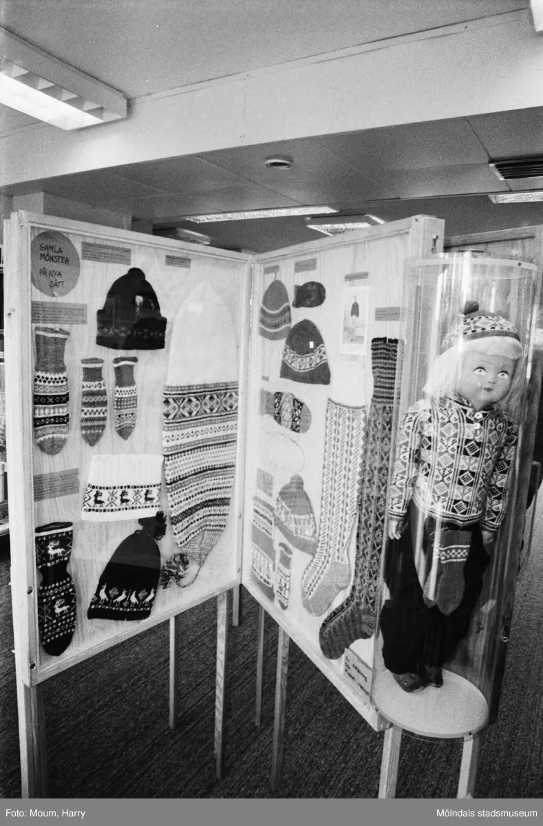 Titel: Utställning om halländsk stickning, binge, på Kållereds bibliotek, år 1983. För mer information om bilden se under tilläggsinformation.