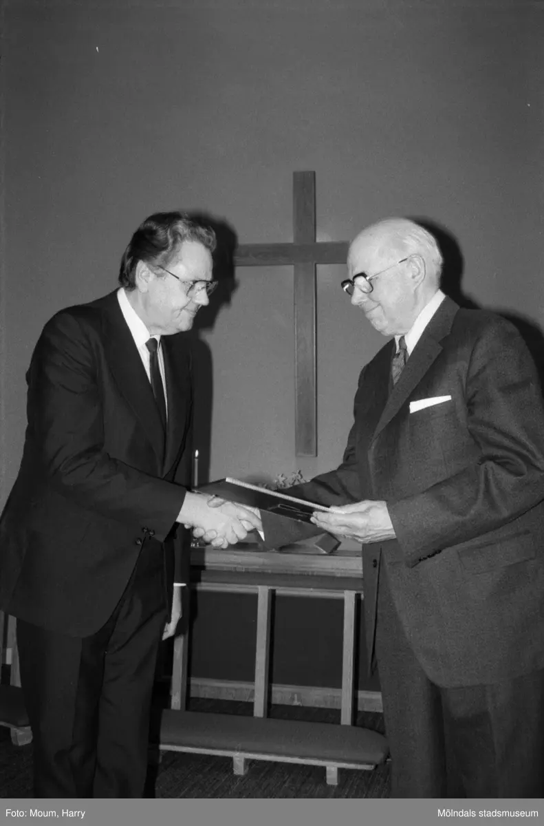 Sångaren Evald Gustavsson får diplom i Kållereds Missionskyrka, år 1985. "Bo Ohlgren delade ut diplom till 80-årige körsångaren Evald Gustavsson."
