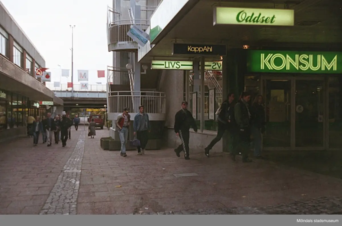 Nygatan söderut med bron i fonden. Mölndalsbro i dag - ett skolpedagogiskt dokumentationsprojekt på Mölndals museum under oktober 1996. 1996_1264-1282 är gjorda av högstadieelever från Åbyskolan 8A, grupp 2. Se även 1996_0913-0940, gruppbilder på klasserna 1996_1382-1405 och bilder från den färdiga utställningen 1996_1358-1381.
