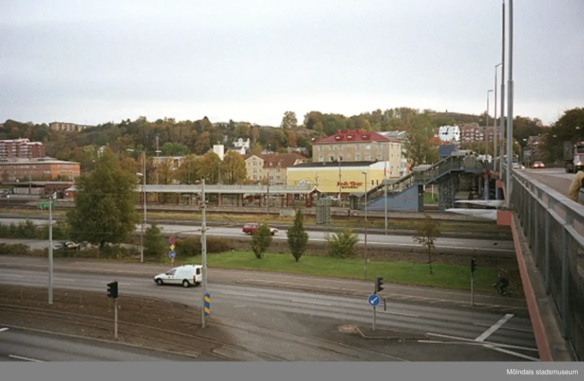 Bron österut över Göteborgsvägen och motorvägen. Mölndalsbro i dag - ett skolpedagogiskt dokumentationsprojekt på Mölndals museum under oktober 1996. 1996_1338-1356 är gjorda av högstadieelever från Åbyskolan 8A, grupp 6. Se även 1996_0913-0940, gruppbilder på klasserna 1996_1382-1405 och bilder från den färdiga utställningen 1996_1358-1381.