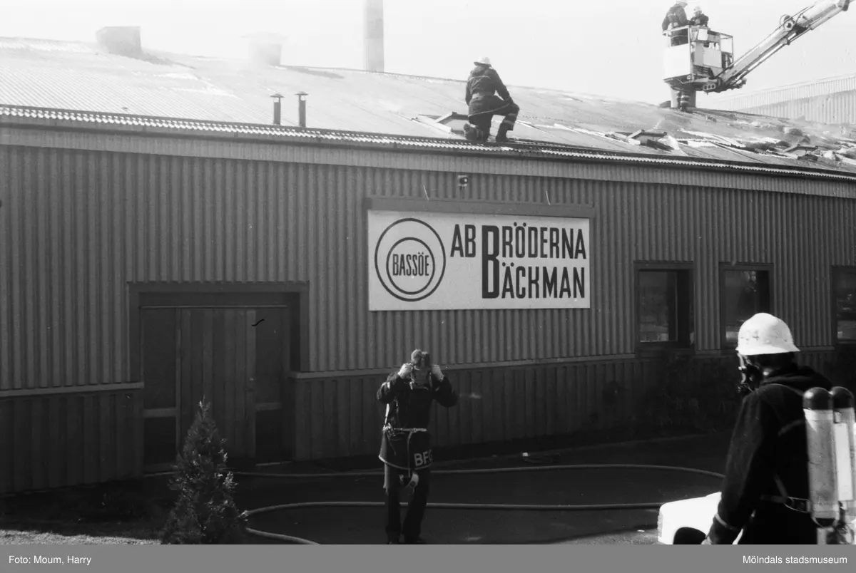 Titel: Brandkåren släcker brand i Bröderna Bäckmans industrilokal vid Gamla Riksvägen i Kållered, år 1984. För mer information om bilden se under tilläggsinformation.