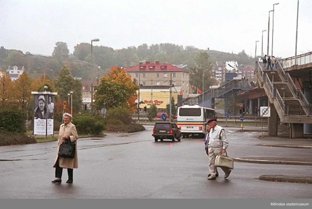Broplatsen där människor är på väg från buss/spårväg till butikerna. Bron och Mölndal station ses till höger. Mölndalsbro i dag - ett skolpedagogiskt dokumentationsprojekt på Mölndals museum under oktober 1996. 1996_1153-1171 är gjorda av högstadieelever från Kvarnbyskolan 9D, grupp 2. Se även 1996_0913-0940.